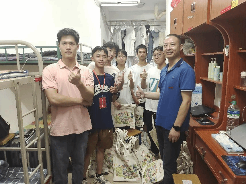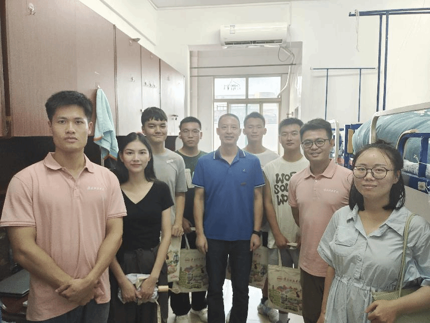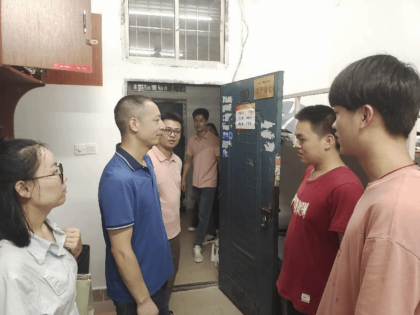 本网讯:为了全面了解新生入学住宿问题,加强与新生的交流沟通,帮助其调整心态更好的适应大学生活。9月9日晚,机电工程系主任刘辉、机电工程系副主任肖志华、2023级新生辅导员卢名亮、曾泽香、周艳霞,一起深入新生寝室,为2023级新生送去温暖与关怀。