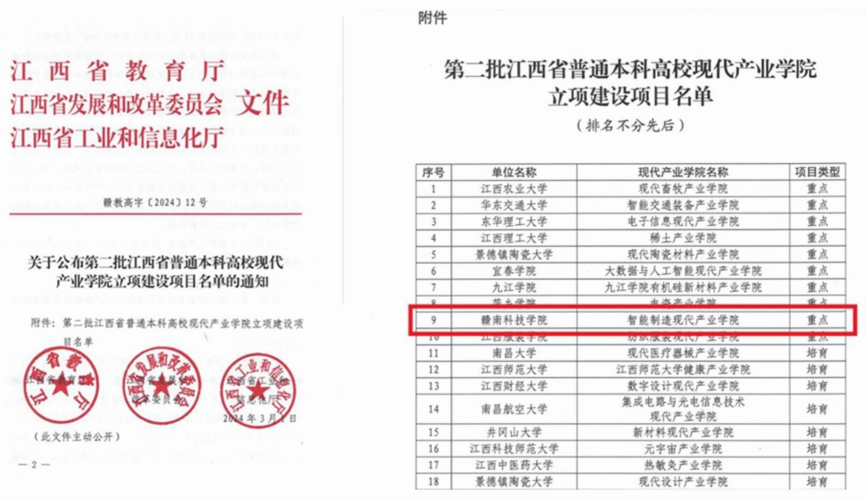 江西省教育厅、江西省发展和改革委员会、江西省工业和信息化厅联合印发《关于公布第二批江西省普通本科高校现代产业学院立项建设项目名单的通知》(赣教高字〔2024〕12号),此次全省共立项重点项目10项、培育项目14项。米乐mile官网智能制造现代产业学院荣获省级重点项目。实现了米乐mile官网省级现代产业学院零的突破。