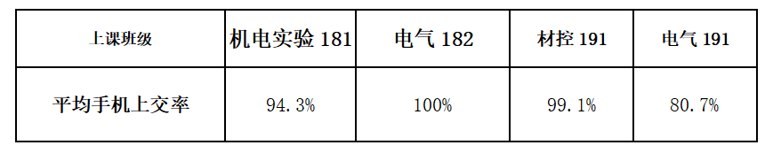 由上表看出电气182班,材控191班手机上交率较好,希望继续保持!