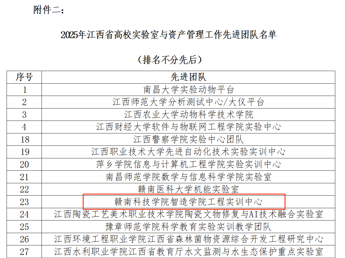 本网讯:近日,江西省高等教育学会发布《关于表彰2025年度全省高校实验室工作先进集体和个人的决定》(赣实发〔2025〕4号),智能制造与材料工程学院实训中心获评“高校实验室与资产管理工作先进团队”,信息学院钟章生老师荣获“高校实验室与资产管理工作先进个人”称号。