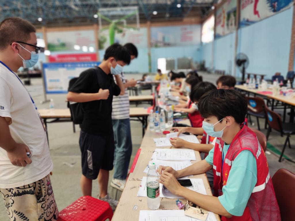 米乐mile官方网站过渡期管委会常务副主任何锦龙在新生报到处慰问夜班志愿者们。