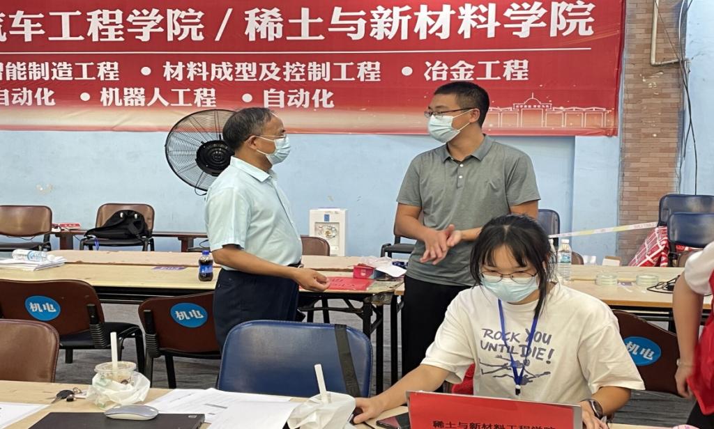 机电工程系主任刘辉老师在新生报到处关心慰问志愿者们。