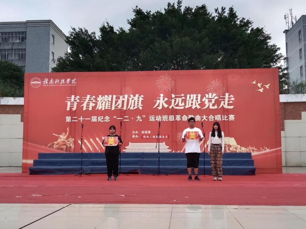 时间来到晚上七点,夜幕也已来临。机电工程系刘辉主任、肖志华老师和思政部徐帆老师也出席了此次比赛。在激烈而又紧张的比赛过程中,冶金222班以优异成绩斩获一等奖,机器人221班与材控221班荣获二等奖,冶金221班、机械223班与自动化222班荣获三等奖。冶金221班陈笑涵同学荣获“最佳指挥”称号,机器人221班黄景森同学荣获“最佳领唱”称号,材控221班王浩志同学荣获“最佳朗诵”称号。