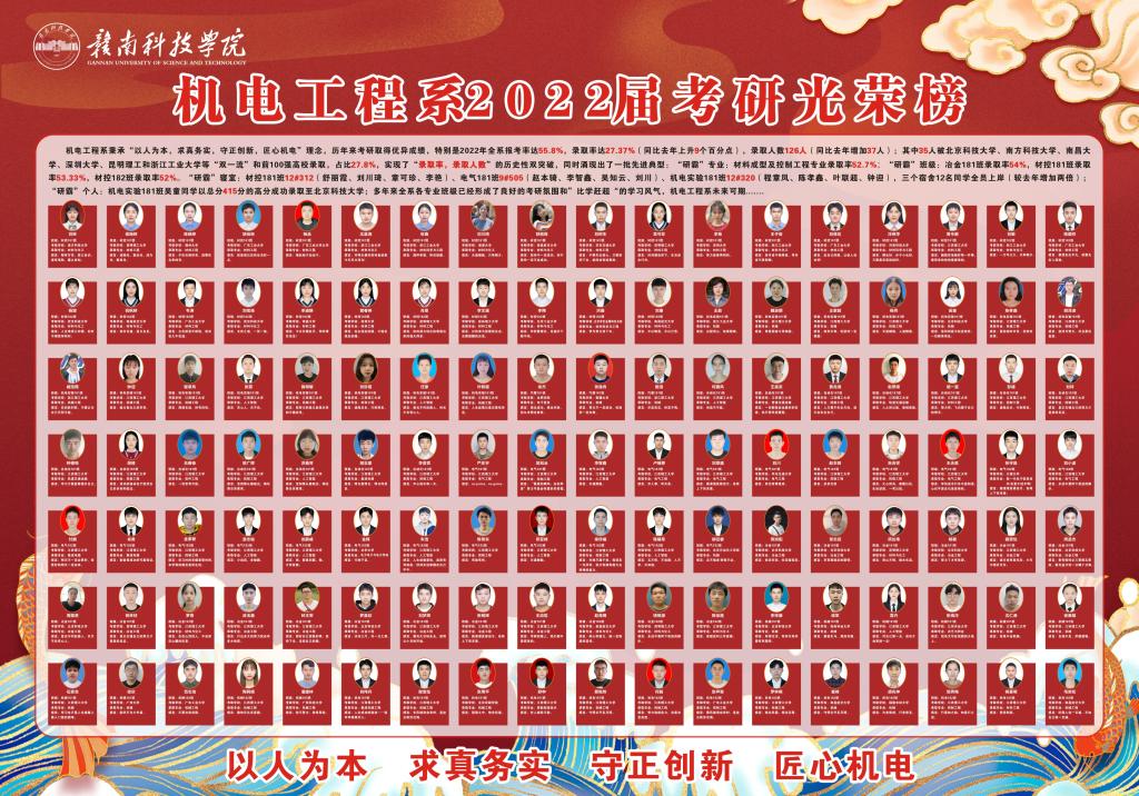 本网讯(孔靖宇、刘林英、张晓猛):在学校党委党政的正确领导下,全系所有老师及同学们的共同努力下,机电工程系2022年考研取得新的突破!2022年全系报考率达55.8%,录取率达27.81%,录取人数126人,实现了“录取率突破20%,录取人数突破100人”的双突破,同时涌现出了一批先进典型集体及个人。