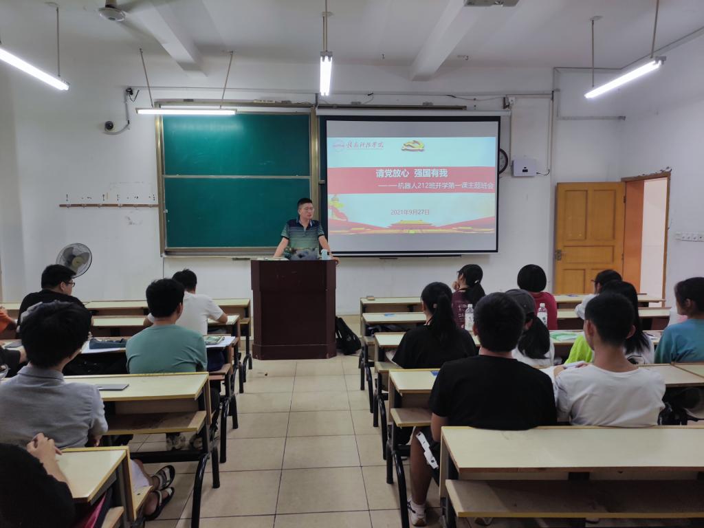 9月27日,机器人工程212班开展“请党放心,强国有我”主题教育活动,学校过渡期管理委员会委员、机器人212班“三联系”领导付玉华参加班会并为全体学生宣讲习近平总书记“七一”讲话重要精神。