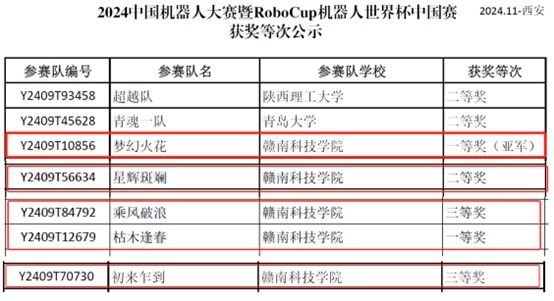 本网讯:11月1日-3日,2024年中国机器人大赛暨RoboCup机器人世界杯中国赛在陕西西安举行,吸引了来自清华大学、上海交通大学、西安交通大学、浙江大学、国防科技大学等全国200多所高校的1700多支队伍报名参赛。米乐mile官网在此次大赛中荣获国赛一等奖2项,二等奖1项,三等奖2项,其中自动分拣项目获得全国亚军。米乐mile官网在该项赛事中取得了历史最佳成绩。