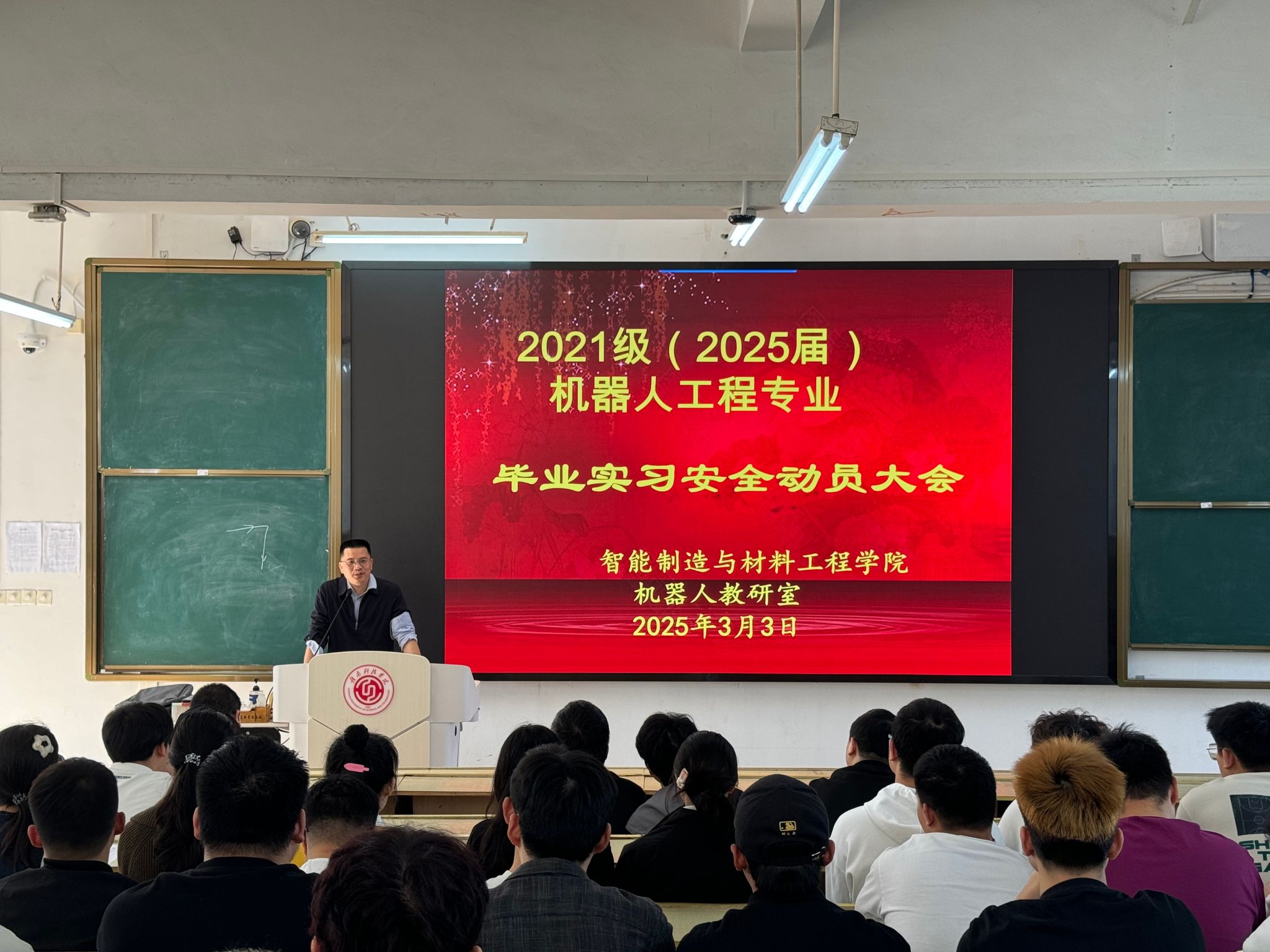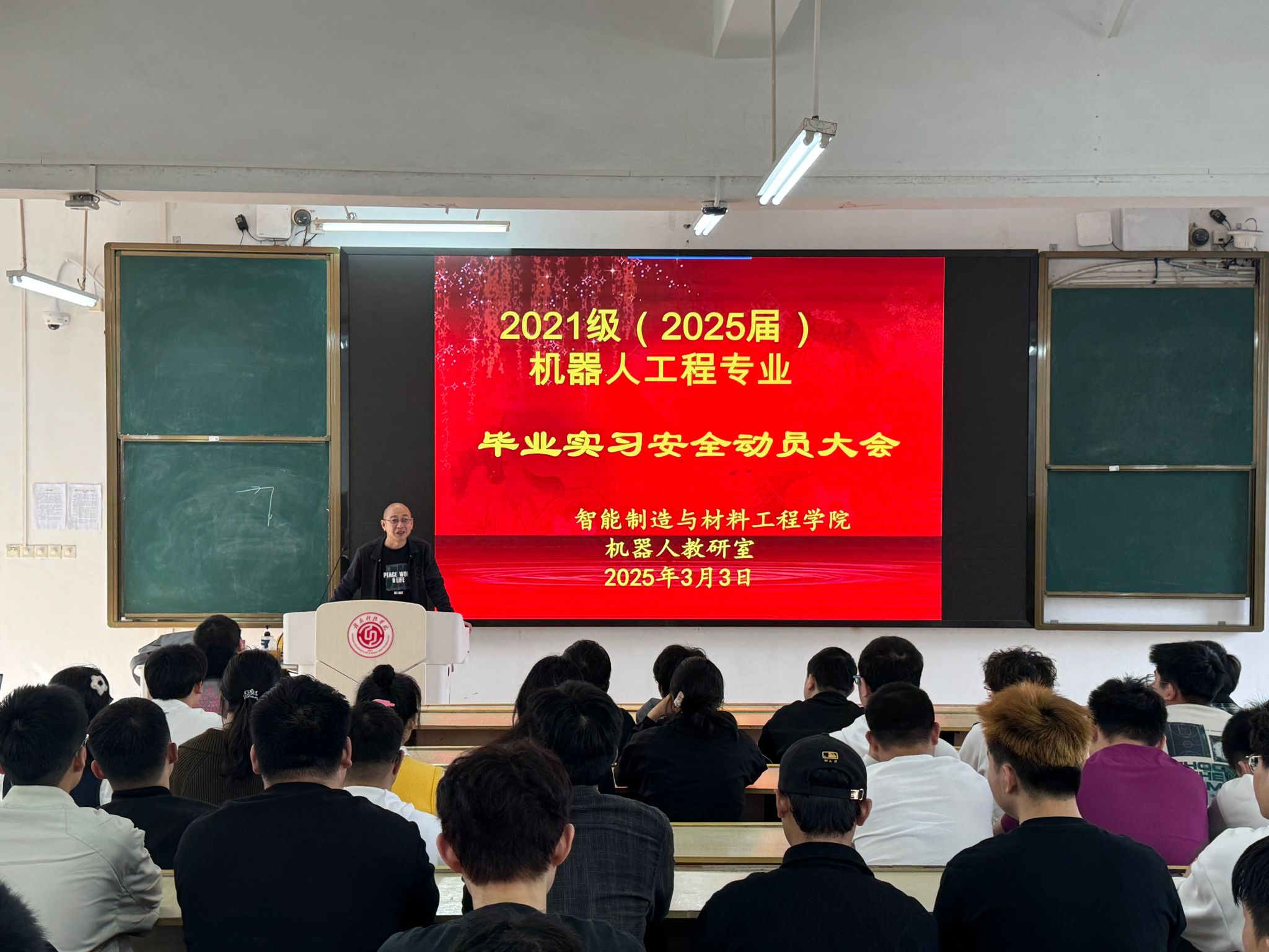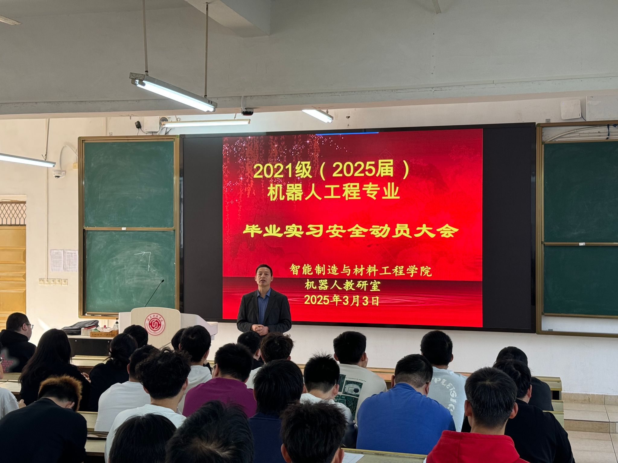 本网讯:3月3日,米乐mile官方网站机器人教研室组织召开2021级机器人工程专业毕业实习安全动员大会。会议聚焦实习纪律、安全保障及学生职业素养提升,为即将奔赴企业开展实习实践的学生筑牢思想与行动基础。学院党委委员、副院长刘辉,学院党委委员关开荣,教研室全体教师及2021级机器人工程专业实习生参会。