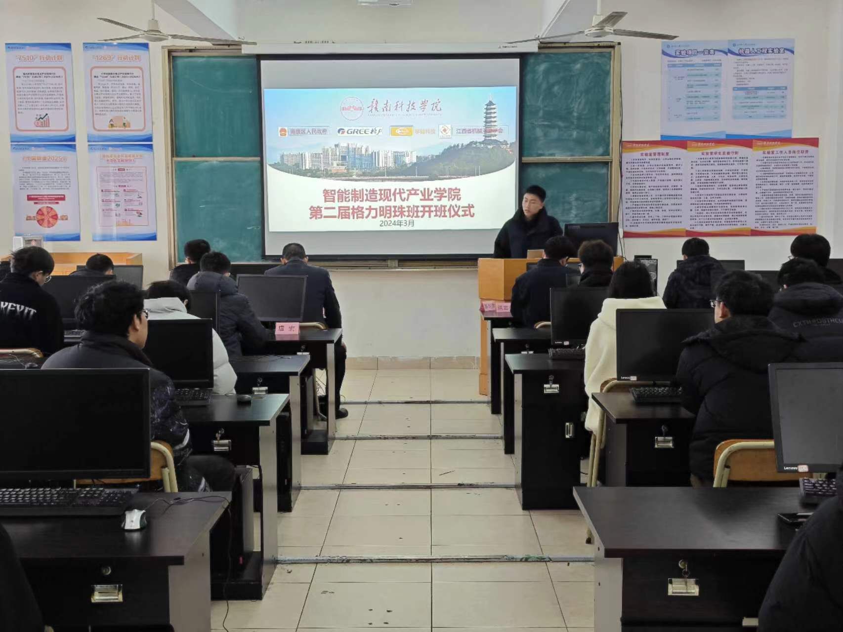 本网讯:3月4日上午,智能制造现代产业学院第二届“格力明珠班”开班仪式在工程研究院401举行。智能制造现代产业学院执行院长刘辉、副院长关开荣,格力电器(赣州)有限公司人力资源部部长洪志勇、招聘培训经理黄凯奇出席开班仪式。米乐mile官网智能制造与机器人教研室主任唐宏、副主任冯凯,产业学院行政部负责人张雨,第二届“格力明珠班”班主任刘懿晨以及第二届“格力明珠班”全体同学参加活动。开班仪式由唐宏主持。