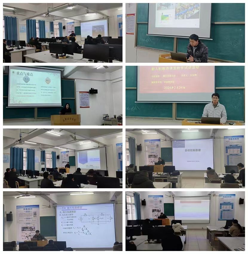 新能源教研室的林锦良、陈玉萍和李盛凯分别试讲了《材料化学》、《表面与界面化学》和《材料检测技术》三门课程;智能制造与机器人教研室的刘懿晨和汪志刚两位老师分别试讲了《机器人控制技术》、《工业互联网基础》;实训中心郝志红、何扬两位老师分别试讲了《材料制备方法》、《三维实体设计》;冶金教研室刘耀、刘东辉和邱森老师分别试讲了《塑料成型工艺与模具设计》、《稀土元素化学》、《有色冶金原理》;电气教研室曾钰清、曾希两位老师分别试讲了《模拟电子技术》、《自动控制原理》