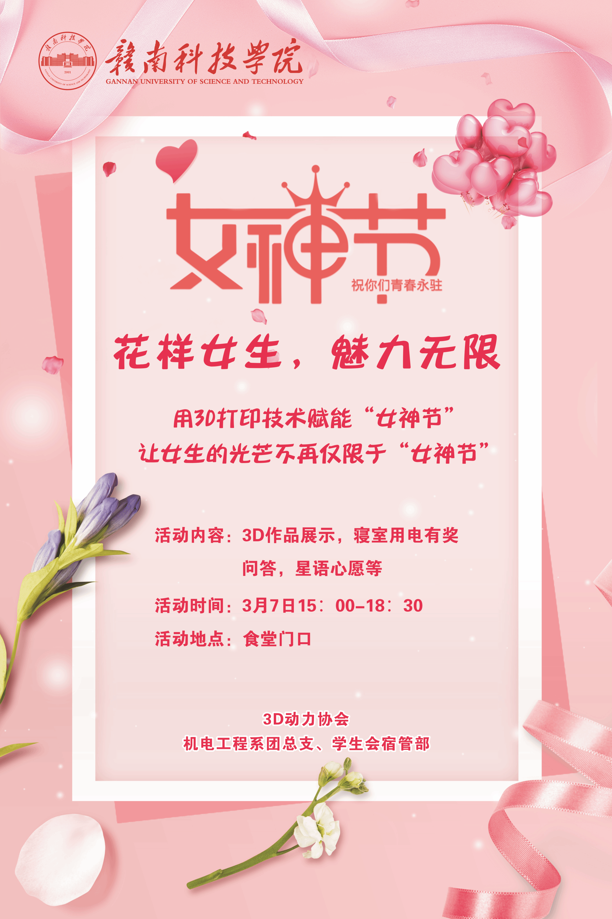 本网讯:春暖花开时,魅力四射日,在这三月和煦的春风里,为丰富校园文化生活,关怀米乐mile官网广大女生,展现在校女大学生风采,放飞梦想,构建和谐校园。3月7日下午,米乐mile官方网站机电工程系团总支学生会协同3D动力协会为女生们搭建了一个展示自我的舞台,并送上温馨的节日祝福。
