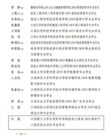 本网讯:近日,共青团江西省委印发《关于表彰全省五四红旗团委(团支部)、全省优秀共青团员、全省优秀共青团干部的决定》,应用科学学院机电工程系2019级电气工程及其自动化专业学生刘晟同学荣获2021年度“全省优秀共青团员”称号。